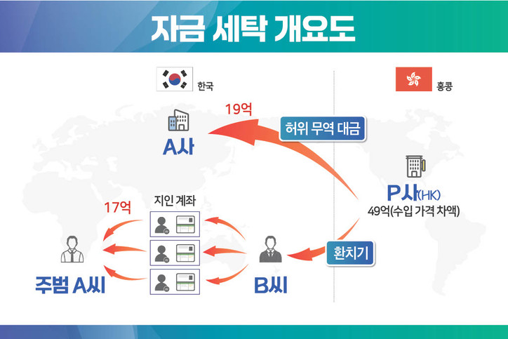 조사결과 차액 49억원은 공범 B씨가 환치기 등을 통해 A씨 처, 자녀, 지인 등 20여 개 계좌로 분산 반입하거나 한국에서 홍콩으로 산업안전용품 등을 수출하는 것처럼 가장(자금세탁)해 국내로 반입한 것으로 확인됐다.