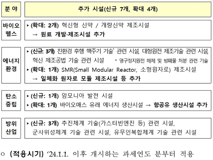 또한, 국가전략기술 사업화시설 범위가 확대된다. 현행 반도체, 이차전지, 백신, 디스플레이, 수소, 미래형이동수단, 바이오의약품 7개 분야 50개 시설에서 디스플레이 및 수소분야 시설 추가 등으로 54개 시설로 확대된다.