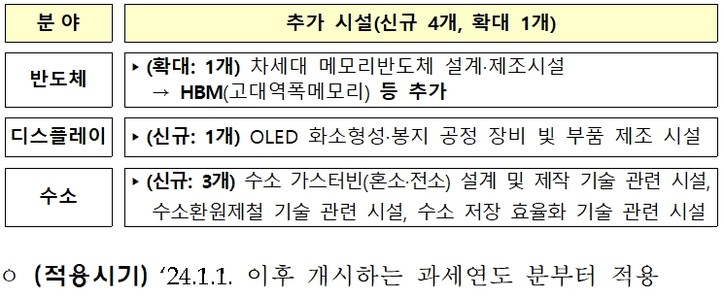 디스플레이 분야에서는 OLED 화소형성·봉지 공정 장비 및 부품 제조 시설이 추가되고, 수소분야에서는 가스터빈(혼소·전소) 설계 및 제작 기술 관련 시설, 수소환원제철 기술 관련 시설, 수소 저장 효율화 기술 관련 시설 등 3개가 신규로 추가됐다. 반도체분야는 차세대 메모리반도체 설계·제조시설 범위를 HBM(고대역폭메모리) 등으로 넓혔다.