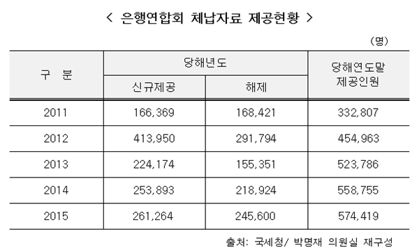 3일 국회 기획재정위원회 소속 새누리당 박명재 의원은 국세청으로부터 제출받은 ‘체납자료 신용정보기관 제공 현황’자료를 통해 이같이 밝혔다.