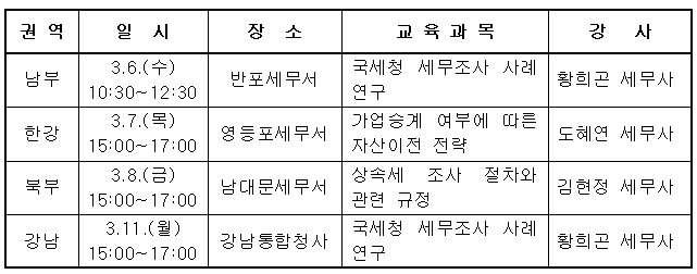 한편, 서울지방세무사회는 7일 영등포세무서에서 한강권역(마포, 용산, 서대문, 은평, 영등포지역세무사회), 8일 남대문세무서에서 북부권역(종로, 남대문, 중부, 성북지역세무사회), 11일 강남통합청사에서 강남권역(역삼, 강남, 삼성지역세무사회) 회원을 위한 전문교육을 각각 실시한다.