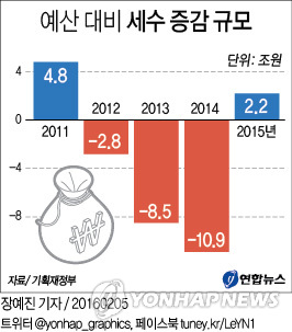 세수 결손은 2012년 2조8천억원, 2013년 8조5천억원 발생했고 2014년에 사상 최대인 10조9천억원의 펑크가 났다.