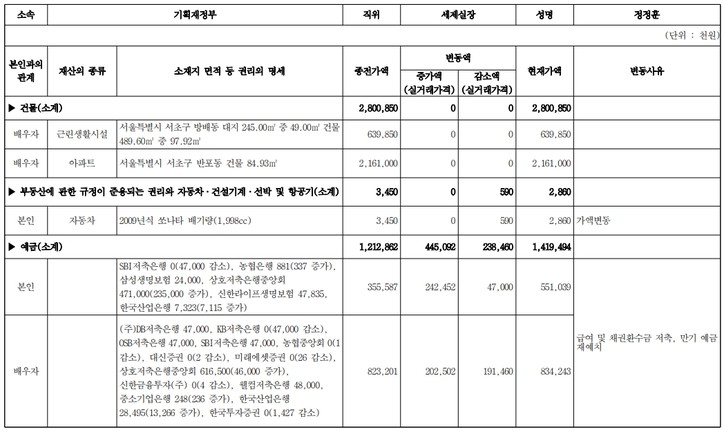 정부공직자윤리위원회는 28일 이 같은 내용을 포함한 고위공직자 재산등록사항을 전자관보에 공고했다.