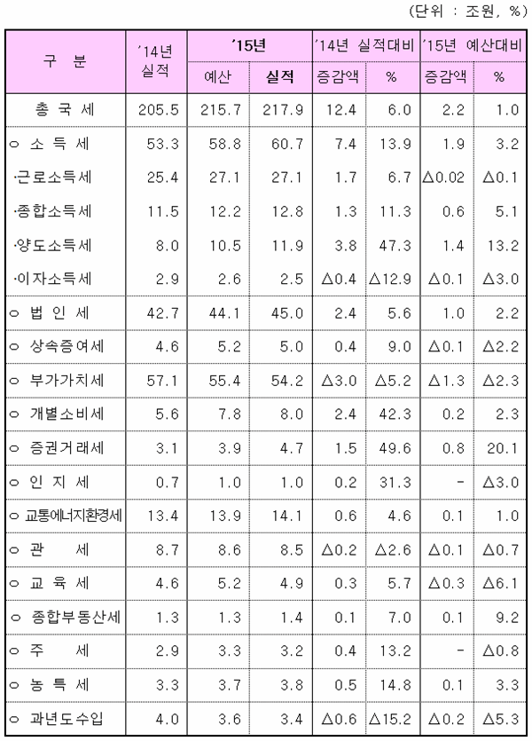 [참고] 2015회계연도 세목별 국세수입 실적▲ [자료제공: 기획재정부] 세정일보 (sejungilbo) 기자의 다른기사 저작권자 © 세정일보 무단전재 및 재배포 금지 관련기사 작년 국세 2조2천억원 더 걷혔다…4년 만에 세수 결손 탈출 최신 기사 차규근 “배당소득 분리과세율 인하 수용못한다…초부자 감세, 불평등만 심화” 관세사회, 우원식 국회의장 면담…성실신고확인제 필요성 설명 [현장] ‘국세공무원의 꽃’ `25년 하반기 서기관 승진자 30명에 임명장 수여식 국세청, ‘기획·정보·대변인실’ 사무관 자리 하나씩 늘린다 동아쏘시오그룹, 중대재해 대응 모의훈련 실시···심폐소생술·자동심장충격기 실습 NH농협은행, 2025년 ‘디지털금융 혁신대상‘ 최종 우수사례 선정 韓 3분기 경제성장률 26개국 중 3위…내년 2.3% 전망도 등장 차규근 “배당소득 분리과세율 인하 수용못한다…초부자 감세, 불평등만 심화” 추천기사 국세청, 태광산업 세무조사 ‘인프라·레저 계열사’까지…‘5년 치 장부’ 뒤진다 론스타와 13년 분쟁, 국제투자분쟁에서 최초 ‘대한민국 승’…조세주권 지켰다 국세청, 세무공무원 출신 세무사 등 ‘세금 유튜버’ 전수 확인했다 상속세 과세, 유산취득세로 변경 시 ‘국세청 세무조사 조항’도 바뀐다 '마약의 나라' 되나?…청년층 타깃 클럽마약 '케타민의 급습' 5년간 7.3배 급증 [세미콜론] 아직도 이런 폐습이~…국세청 ‘간부 모시는 날’ 고강도 감찰