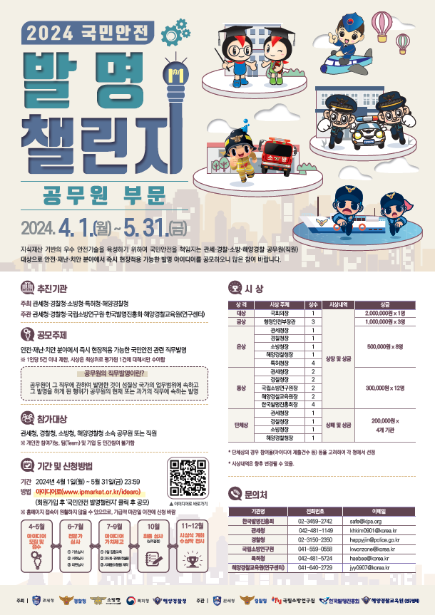 관세청은 특허청, 경찰청, 소방청, 해양경찰청과 함께 ‘2024 국민안전 발명챌린지’ 공무원 부문 아이디어 접수를 1일부터 5월 31일까지 진행한다.