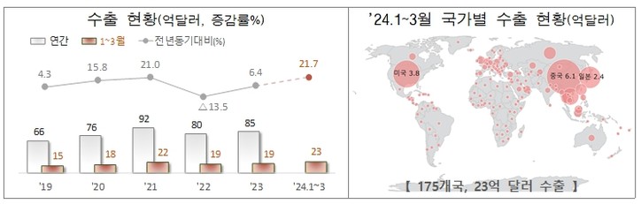 올해 1~3월 수출액은 `21년 연간 역대 최대 동기간 실적 22억 3000만달러를 넘어서 연간 최대 수출기록 돌파 기대감이 높아지고 있다.