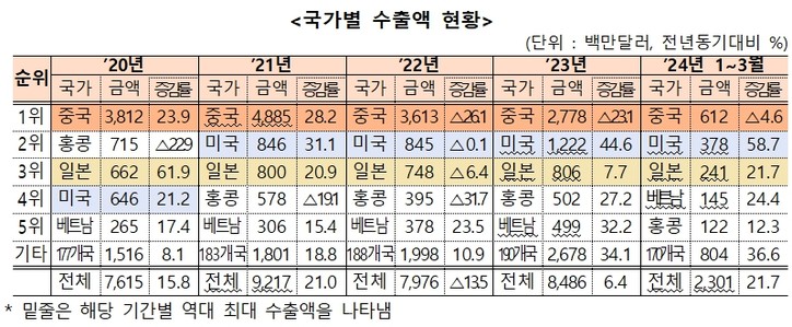 국가별로는 동기간 수출액 기준 중국 26.6%, 미국 16.4%, 일본 10.5% 등 동기간 역대 최다인 175개국으로 수출이 이뤄졌다.
