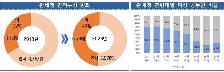 특히 여성 공무원 비율은 관세청 전체 인력의 49%(2730명)로, 이는 10년 전에 비해 17%p 증가한 수치이다. 이 중 58%(1585명)가 40세 이하이며, 자녀를 양육 중인 직원도 49%(1349명)를 차지하고 있다.