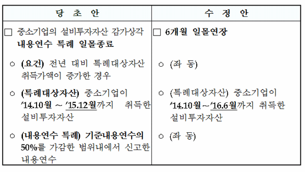 법인세‧소득세법 시행령중 중소기업의 설비투자자산 감가상각 내용연수 특례 일몰종료 조항이 △6개월 일몰연장으로, 또 특례대상 자산의 기준이 ‘중소기업이 `14년.10월~`15.12월까지 취득한 설비투자자산에서 △중소기업이 `14.10월~`16.6월까지 취득한 설비투자자산’으로 수정됐다.