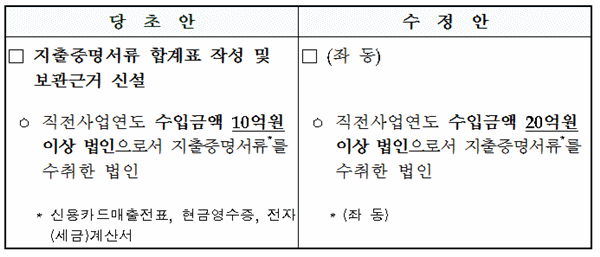 이와함께 법인세법령중 지출증명서류 합계표 작성대상 법인 축소와 관련 당초 ‘직전사업연도 수입금액 10억원 이상 법인으로서 지출증명서류를 수취한 법인에서 △직전사업연도 수입금액 20억원 이상법인으로서 지출증명서류를 수취한 법인’으로 수정됐다.