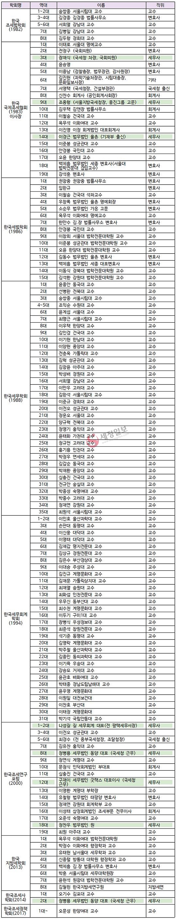 17일 세정일보가 조세 관련 학회 9곳의 역대 학회장 프로필을 분석한 결과, 130명의 학회장(중복 포함) 중 교수가 98명(75.4%)으로 가장 많았고, 뒤를 이어 변호사 15명(11.5%), 세무사 8명(6.2%), 회계사 5명(3.8%), 기타 4명(3.1%) 등으로 집계됐다.