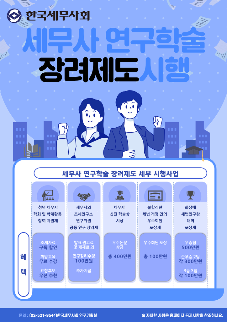 ‘세무사 연구학술 장려제’는 △청년 세무사 학회 및 학계활동 참여 지원제 △세무사회원-조세연구소 연구위원 공동연구 장려제 △세무사 신진 학술상 시상 △불합리한 세법 개정 건의 우수회원 포상제 △회장배 세법 연구왕 대회 포상제 등 5개 부문으로 운영된다.
