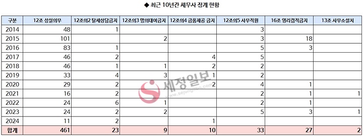 세정일보가 지난 10년(`14년~`24년 현재)간 세무사징계위원회에서 징계를 받은 세무대리인을 조사한 결과 총 542명이 징계를 받았다. 이마저도 재논의, 재조사, 징계 곤란 등은 제외한 숫자다. 특히 올해 들어 1월을 제외하고 2, 3, 4월 모두 징계위원회가 열렸고 14명의 세무대리인이 징계를 받은 것으로 나타났다.