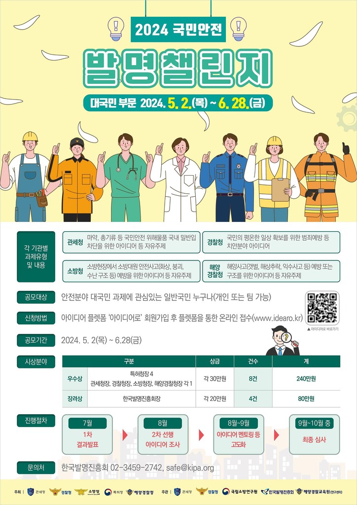 관세청은 특허청, 경찰청, 소방청, 해양경찰청과 함께 ‘2024 국민안전 발명챌린지’ 대국민 부문 아이디어 접수를 2일부터 6월 28일까지 진행한다.
