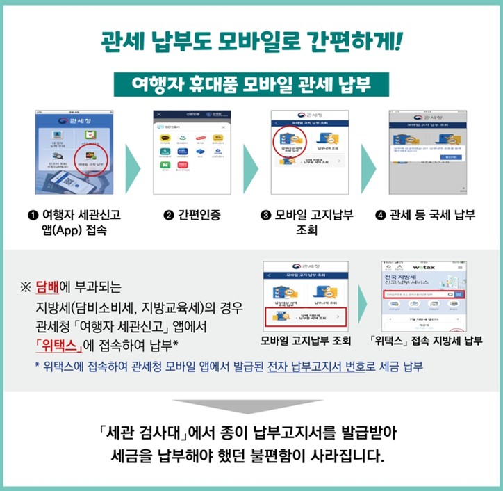 - 여행자는 본인인증 등 간편인증 후 ‘모바일 고지 납부’ 메뉴에 접속하여 수신된 관세 등 납부고지서를 조회한 뒤 관세를 납부할 수 있습니다.