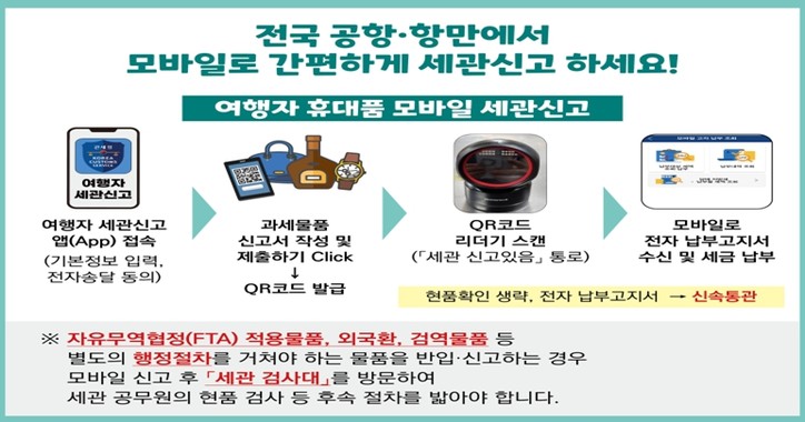 ◇ 종이 신고서를 작성하지 않아도 「여행자 세관신고」 앱(App)을 통해 전국 공항·항만에서 모바일로 간편하게 세관에 신고할 수 있습니다.