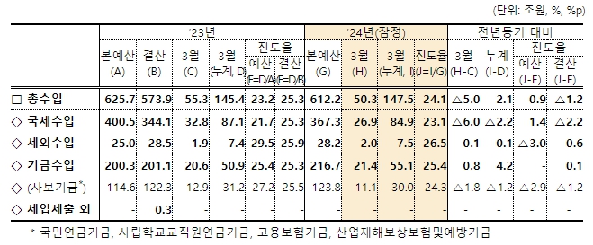 3월까지 누계 총수입은 147조5000억원으로 지난해 같은 기간보다 2조1000억원 증가했다. 기금수입 증가 등이 영향을 미쳤는데, 기금수입은 전년보다 4조2000억원 증가한 55조1000억원, 세외수입은 7조5000억원으로 지난해보다 1000억원 늘었다.
