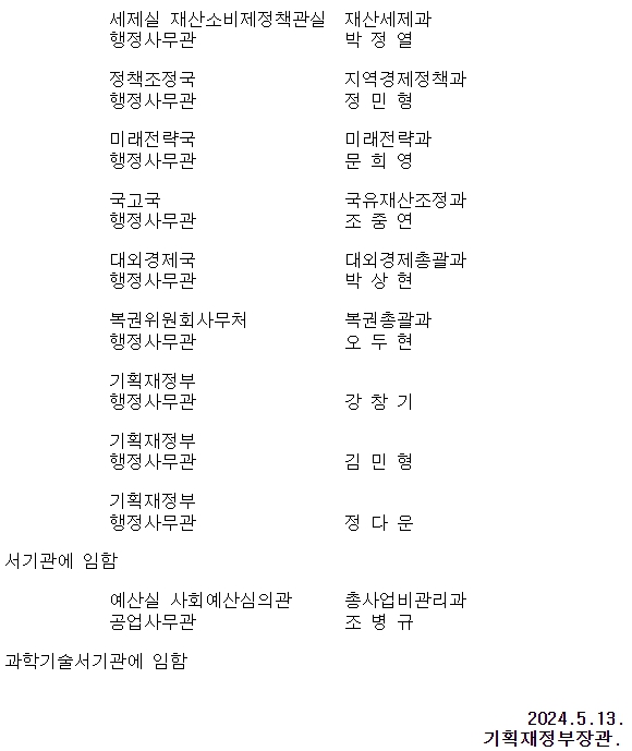▲ 재산세제과 박정열 ▲ 지역경제정책과 정민형 ▲ 미래전략과 문희영 ▲ 국유재산조정과 조중연 ▲ 대외경제총괄과 박상현 ▲ 복권총괄과 오두현 ▲ 기획재정부 강창기 김민형 정다운 ▲ 총사업비관리과 조병규