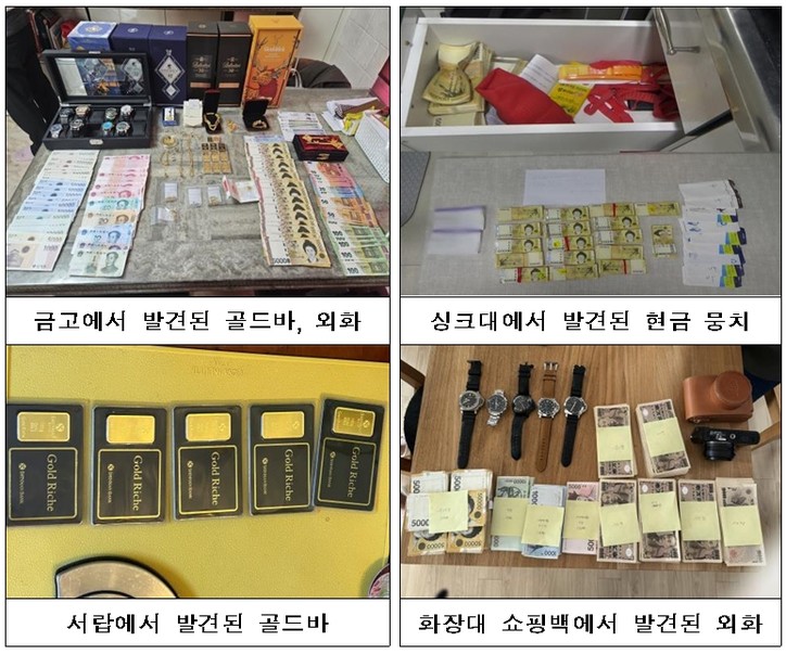 수색 집행으로 금고, 옷장, 싱크대 등에 숨겨 놓은 골드바, 귀금속, 외화·현금, 명품시계 등 총 5억원 징수
