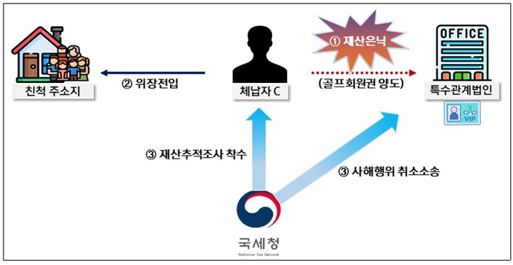 ○C는 고지된 세금을 체납하면 강제징수가 취해 질 것임을 예상하고 체납 발생 직전에 ○억원 상당의 골프회원권을 본인이 대주주로 있는 특수관계법인에게 양도, 양도 후에도 실제로는 개인적으로 계속 사용
