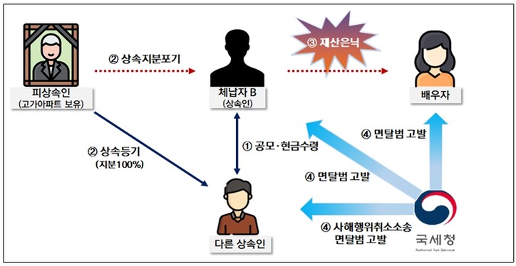 - 이에 B는 다른 상속인과 짜고 아파트에 대한 본인의 상속지분을 포기하였으며, 대신에 다른 상속인으로 하여금 이에 상당하는 현금을 본인의 배우자에게 지급하도록 하는 방식으로 재산을 은닉함