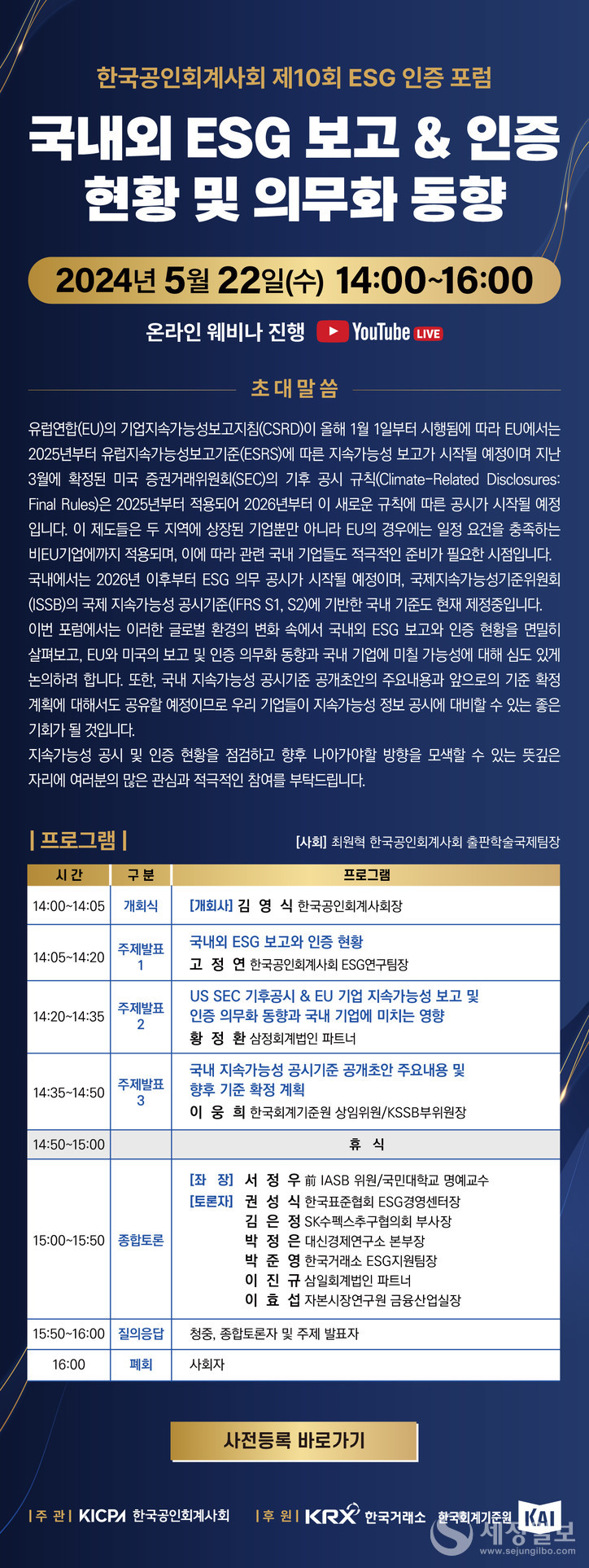 한국공인회계사회(회장 김영식)는 오는 22일 ‘제10회 ESG 인증포럼’을 개최한다고 전했다.
