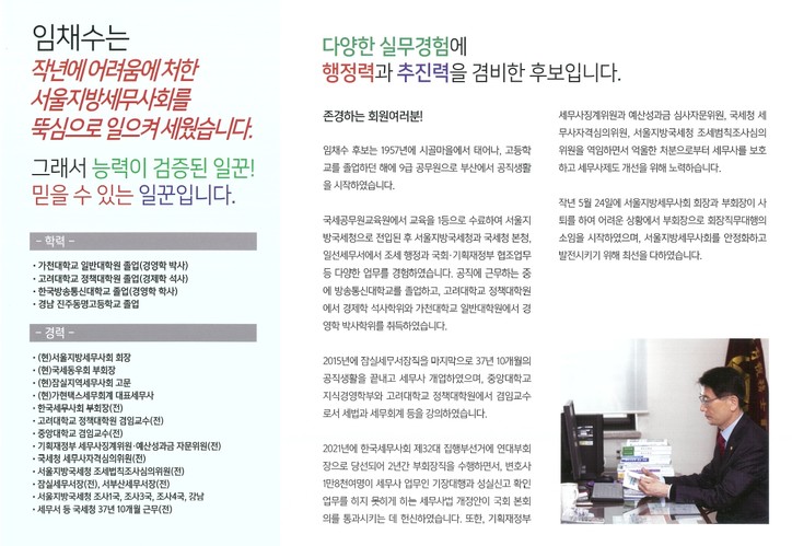 저는 2023. 5. 24.에 부회장이 공석이 된 상태에서 서울지방세무사회 부회장으로 선임되었으며, 또한 전임회장이 선거출마로 사퇴를 함에 따라 부회장 중 연장자인 제가 회장직무대행의 소임을 맡게 되었습니다.