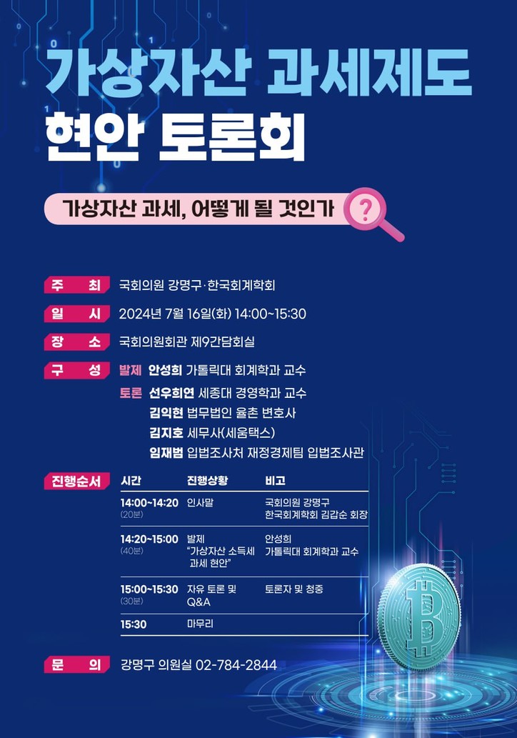 `25년 가상자산에 대한 소득세 과세를 앞두고 16일 국회의원회관에서 국민의힘 강명구 의원과 한국회계학회 공동주최로 ‘가상자산 과세제도 현안 토론회’가 개최됐다.