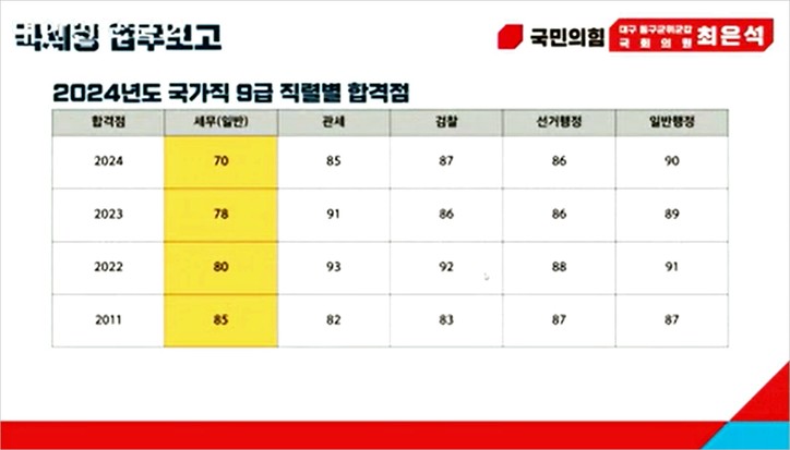 최 의원은 “유독 세무직 합격 점수가 다른 직렬에 비해서 이렇게 연도별로 많이 떨어지고 있다”며 “물론 점수가 우리 전체 우리 인재들의 우수성 여부를 이렇게 단정적으로 보는 건 아니지만, 우리 국세행정이 국가재정에 정말 큰 축을 담당하고 있는데 좋은 인재들이 오지 않으면 장기적으로 봐서 우리 국세청의 업무역량에 대해서 좀 걱정이 되는 것은 사실”이라고 말했다.