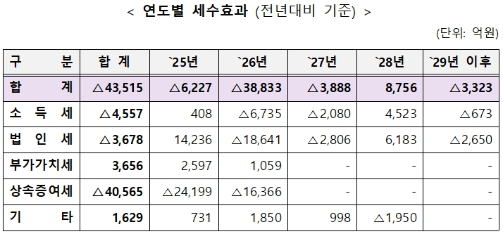 정부는 올해 세법개정에 따른 세수효과를 향후 5년(`25~`29년)간 4조3515억 줄어들 것으로 내다봤다. 특히, 이 중에서 4조565억원이 상속증여세의 세수감 효과인 것으로 나타났다.