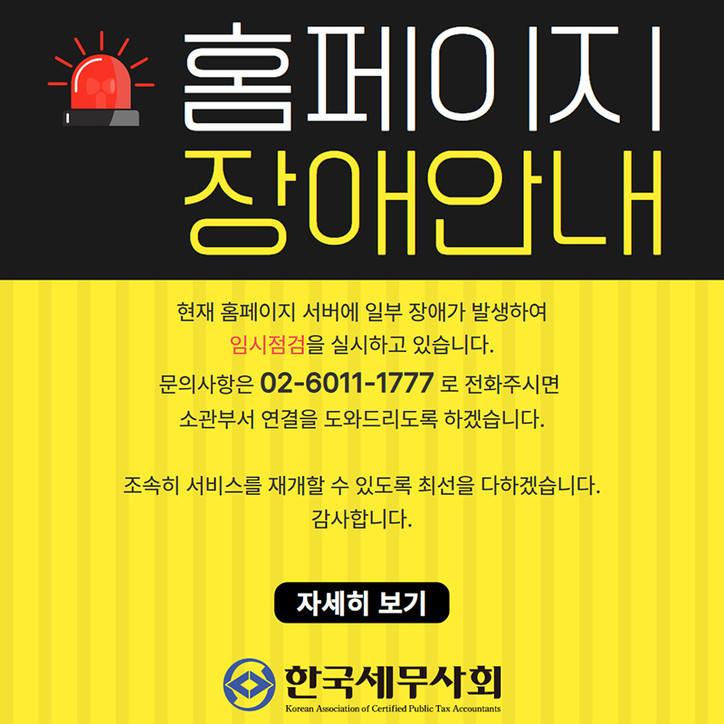 세무사회는 현재 담당부서에서 원인을 분석하여 장애복구 작업을 진행 중에 있으며, 조속한 정상화를 위해 최선을 다하고 있다고 전했다.