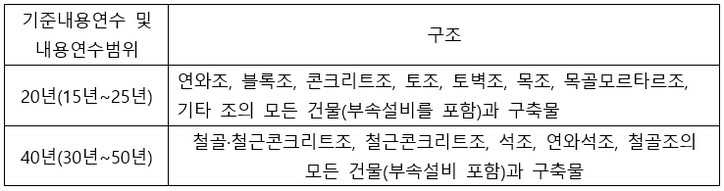 건물의 기준내용연수 및 내용연수범위는 다음과 같습니다.