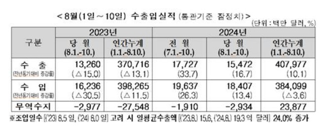 조익노 산업통상자원부 무역정책관은 "8월 휴가 등 계절적 요인 영향에도 반도체를 포함한 정보기술(IT) 품목과 자동차·선박 등 주력 품목을 중심으로 수출 우상향 흐름이 이어지고 무역수지 또한 월말로 갈수록 개선될 것으로 기대한다"고 밝혔다.