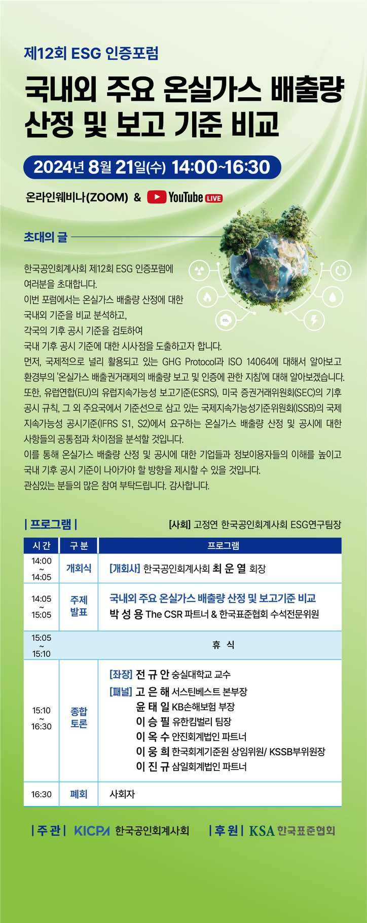 한국공인회계사회(회장 최운열)는 오는 21일 ‘제12회 ESG 인증포럼’을 웨비나로 개최한다.