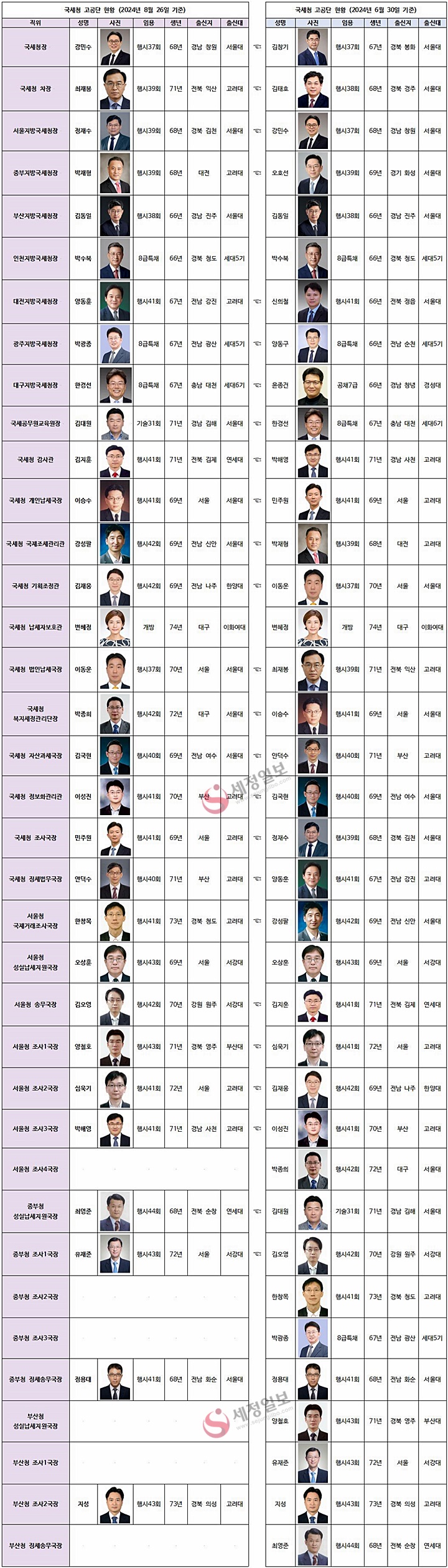 26일자로 단행된 강민수 국세청호의 고공단 라인업이 모습을 드러냈다. 취임후 조금 긴 시간이 걸리긴 했으나, 조직의 안정과 일 잘하는 국세청을 만들기 위한 인사수급이 역력하게 나타났다. 서울국세청 조사4국장, 중부국세청 조사2국장, 3국장, 강남세무서장 등 몇 개 자리만 채우면 퍼즐은 완성된다.