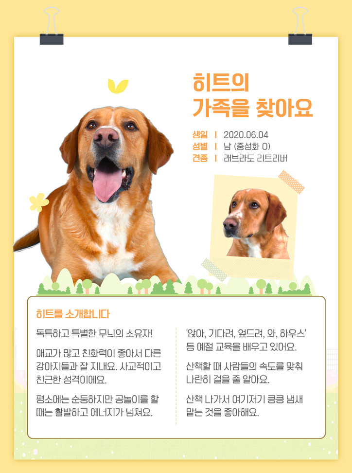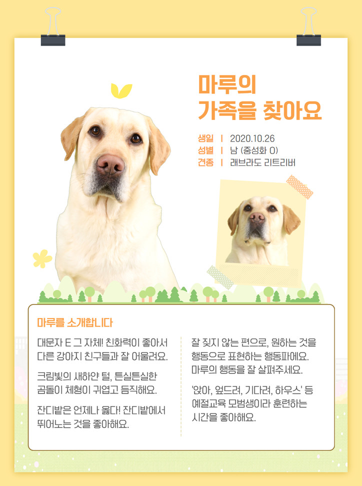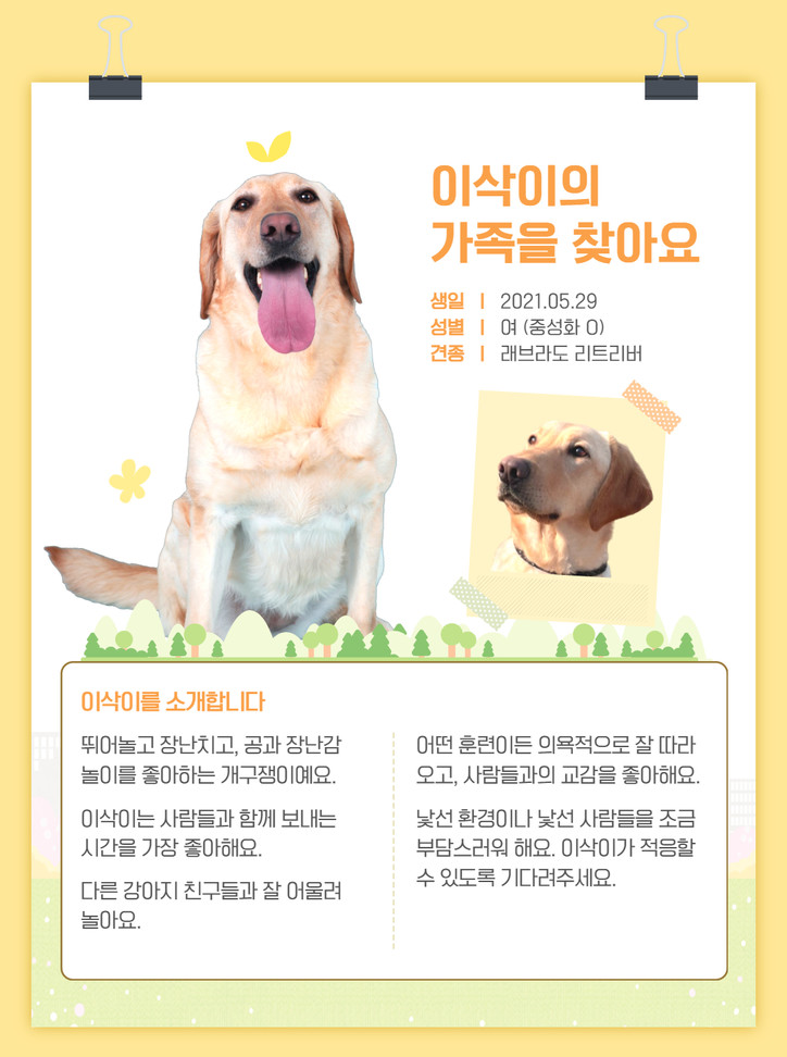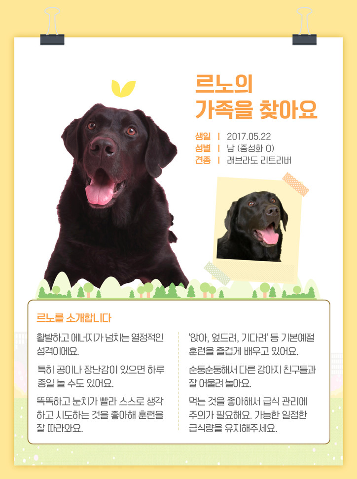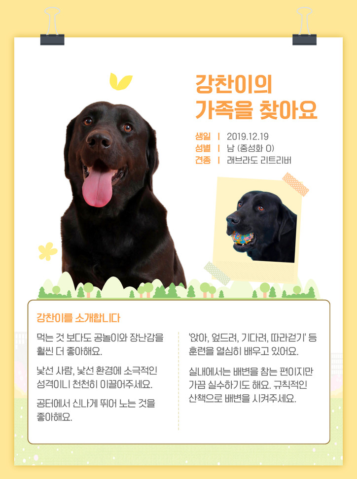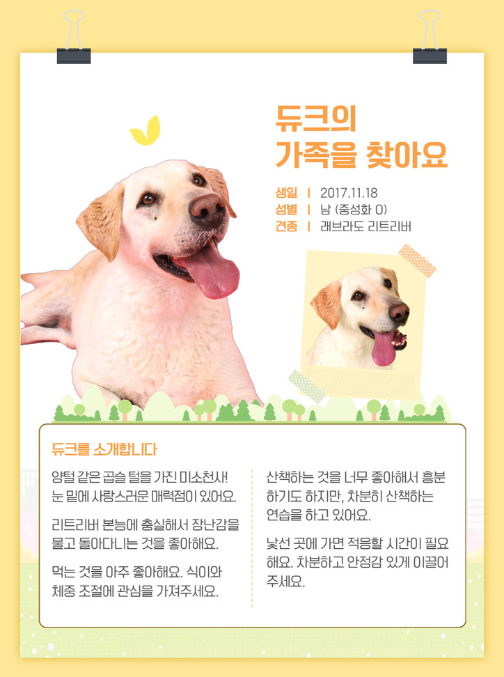 분양 대상견은 모두 래브라도 리트리버 종의 25kg 이상 대형견으로, 온순하고 영리해 훈련 과정 중 사랑을 듬뿍 받아왔으며 활동성이 뛰어나 함께 놀아주고 자주 산책을 하는 등의 적극적인 반려인에게 적합하다.
