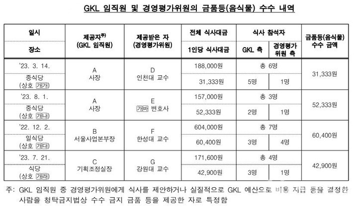 감사원 감사결과 GKL 사장, 서울사업본부장, 기획조정실장 등 3명은 지난 2022년 12월부터 지난해 8월까지 4차례에 걸쳐 GKL 경영평가위원 4명에게 각각 업무협의 등을 목적으로 식사를 제공해 청탁금지법을 위반했다.