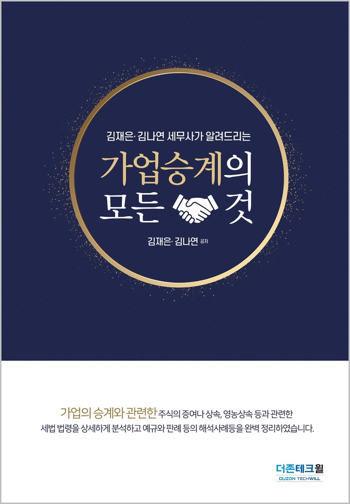 최근에는 정부에서 가업의 승계와 관련한 규제를 완화하고 적용 규모도 확대하는 등 많은 개선이 있었다. 저자들도 가업승계와 관련한 제도에 대해 꾸준히 분석하고 효과적으로 적용할 수 있도록 하기 위해 연구를 하면서 기업의 고용유지와 장기간 쌓아온 노하우의 유지 발전을 위해 가업승계를 지원해야 한다는 책임감도 느꼈다.