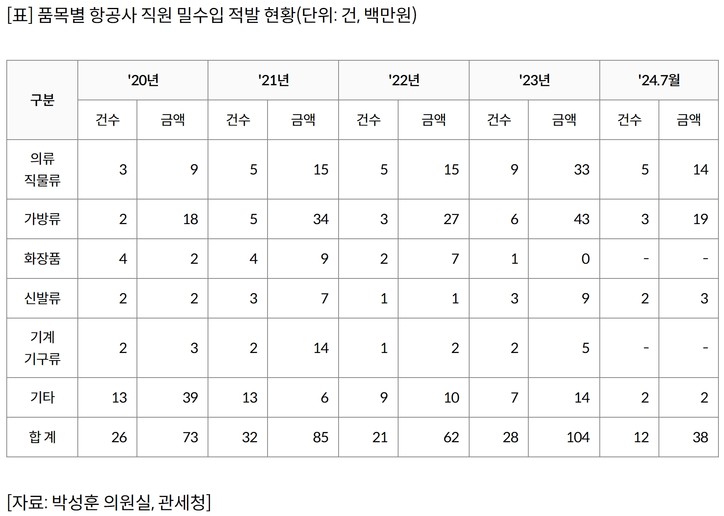 박성훈 의원은 "수시로 외국을 드나드는 항공사 승무원들의 밀수 행위는 직업윤리를 바닥에 던지는 것"이라며 "밀수 사각지대에 놓인 항공사 직원들의 위법 행위에 대한 관리 감독이 더 강화돼야 한다"라고 말했다.