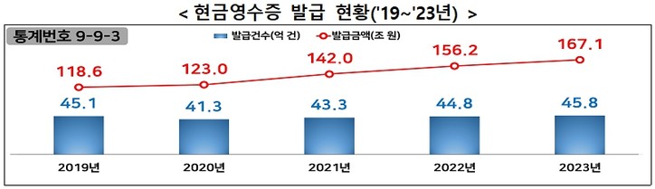 현금영수증 발급은 `19년 45억1000만건, 118조6000억원에서 `20년 41억3000만건, 123조원, `21년 43억3000만건, 142조원, `22년 44억8000만건, 156조2000억원, 지난해 45억8000만건, 167조1000억원으로 집계됐다.