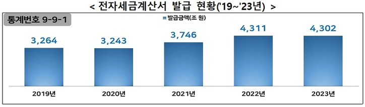 지난해 전자세금계산서 발급금액은 4302조원으로 5년 전보다 31.8% 늘어난 것으로 집계됐다.