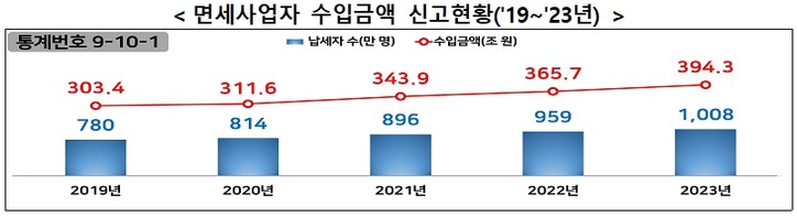 `23년 귀속 부가가치세 면세 수입금액이 있는 개인사업자는 수입금액 등 사업장 현황을 올해 2월 13일까지 신고했으며, 납세자 수는 1008만명이었다.