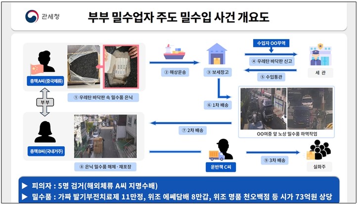 특히 밀수입을 주도한 A씨와 B씨는 부부 관계로, 남편인 A씨가 중국에서 밀수품을 보내면 아내인 B씨가 국내에서 인수한 후 비밀창고로 운반한 다음 건축용 우레탄 바닥판에 숨겨온 밀수품을 꺼내 국내에 유통하려 한 것이 드러났다.