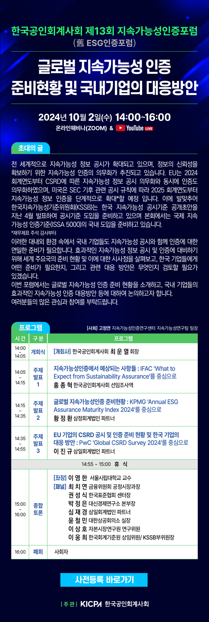 ‘제13회 지속가능성인증포럼’의 참가 신청은 한국공인회계사회 홈페이지(https://www.kicpa.or.kr) 팝업과 공지사항을 통해 가능하며, 포럼 종료 후 한국공인회계사회 회계연수원 및 유튜브 채널에 녹화 영상을 업로드할 예정이다.