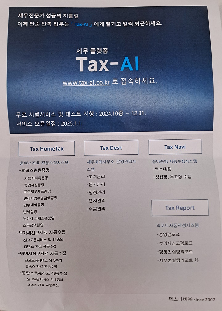 세무회계 사무실의 창의 혁신 아이콘으로 불리는 세무플랫폼 ‘TAX-AI(www. tax-ai.co.kr)’이 개발에 성공, 최근 출시되면서 혁신의 바람을 불러일으키고 있다. 세무플랫폼 ‘TAX-AI’개발 회사는 ㈜택스나비(대표이사 한맹수)로 알려졌다.