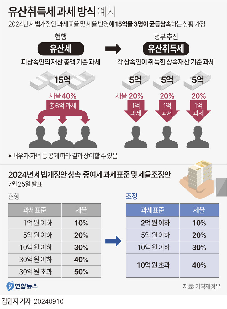 정부는 유산취득세 전환을 위한 개편 방안을 마련 중이며 이르면 내년 상반기 중 관련 법률안을 국회에 제출할 계획이다.
