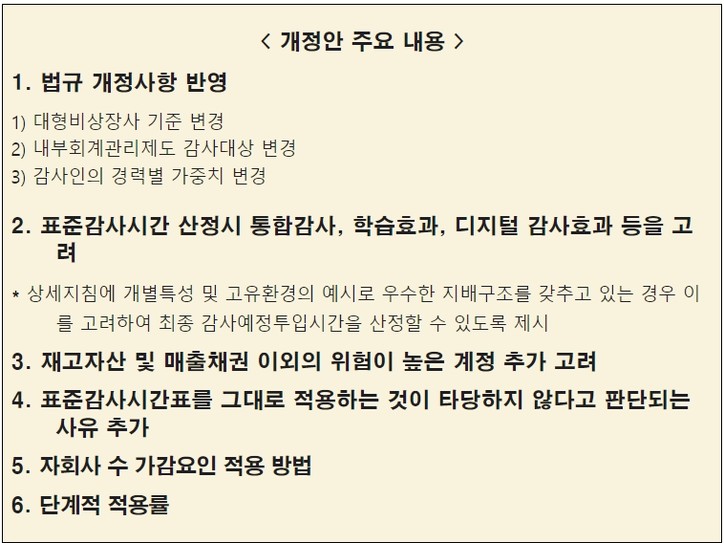 이번 개정안에는 △법규 개정사항 반영 △표준감사시간 산정시 통합감사, 학습효과, 디지털 감사효과 등을 고려 △재고자산 및 매출채권 이외의 위험이 높은 계정 추가 고려 △표준감사시간표를 그대로 적용하는 것이 타당하지 않다고 판단되는 사유 추가 △자회사 수 가감요인 적용 방법 △단계적 적용률 등이 담겼다.