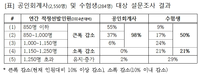 공인회계사의 98%와 수험생의 절반은 “회계사 선발인원을 큰 폭으로 줄여야한다”고 생각하는 것으로 나타났다.