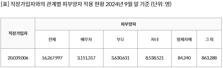 19일 건강보험공단이 조국혁신당 김선민 의원실에 제출한 자료에 따르면 피부양자는 직장가입자에 주로 생계를 의존하는 배우자와 자녀, 부모, 형제자매(30세 미만, 65세 이상) 등으로 보험료를 내지 않더라도 건강보험 혜택을 받을 수 있다.