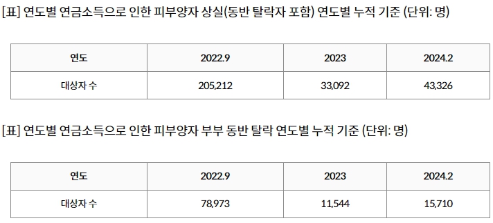 실제로 올해 2월 기준 다른 소득은 전혀 없이 오로지 공무원·사학·군인·국민연금 등 공적연금 소득만으로 연간 2천만원을 넘었기 때문에 피부양자에서 탈락한 사람은 4만3천326명이었는데, 이 중에서 부부 동반 탈락자는 1만5천710명에 달했다.